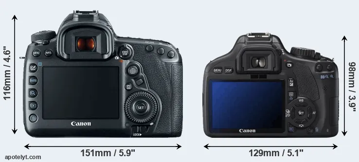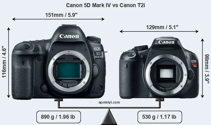 An illustration of the physical size and weight of the Canon 5D Mark IV and the Canon T2i is provided in the side-by-side display below. The two cameras are presented according to their relative size. Three successive views from the front, the top, and the rear are shown. All width, height and depth measures are rounded to the nearest millimeter.