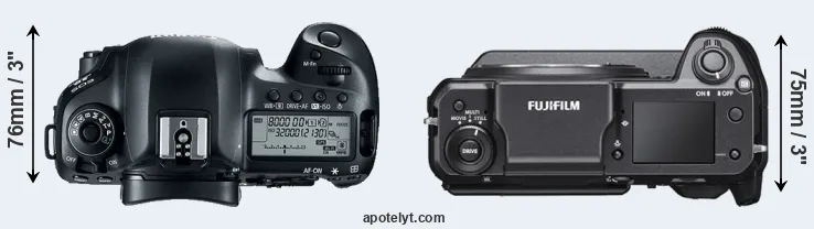 The physical size and weight of the Canon 5D Mark IV and the Fujifilm GFX 100 are illustrated in the side-by-side display below. The two cameras are presented according to their relative size. Three consecutive views from the front, the top, and the rear side are shown. All size dimensions are rounded to the nearest millimeter.