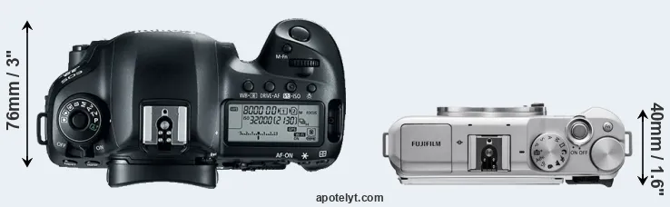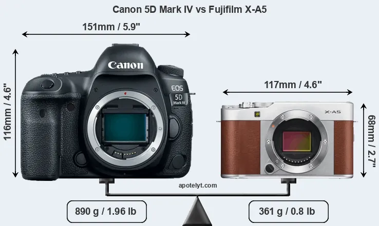 The physical size and weight of the Canon 5D Mark IV and the Fujifilm X-A5 are illustrated in the side-by-side display below. The two cameras are presented according to their relative size. Three consecutive perspectives from the front, the top, and the back are available. All width, height and depth dimensions are rounded to the nearest millimeter.