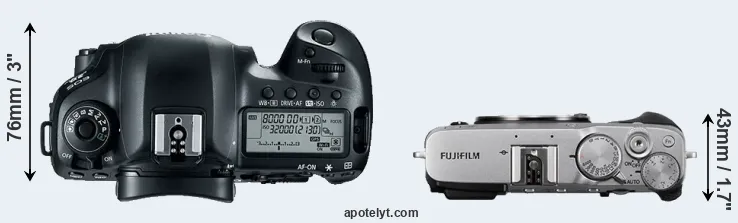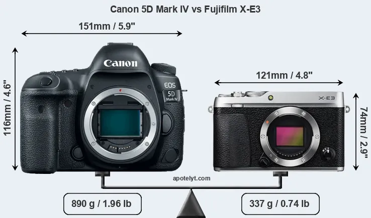 The physical size and weight of the Canon 5D Mark IV and the Fujifilm X-E3 are illustrated in the side-by-side display below. The two cameras are presented according to their relative size. Three successive views from the front, the top, and the rear are shown. All size dimensions are rounded to the nearest millimeter.
