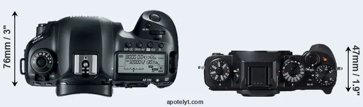 The side-by-side display below illustrates the physical size and weight of the Canon 5D Mark IV and the Fujifilm X-T1. The two cameras are presented according to their relative size. Three consecutive views from the front, the top, and the rear side are shown. All width, height and depth dimensions are rounded to the nearest millimeter.
