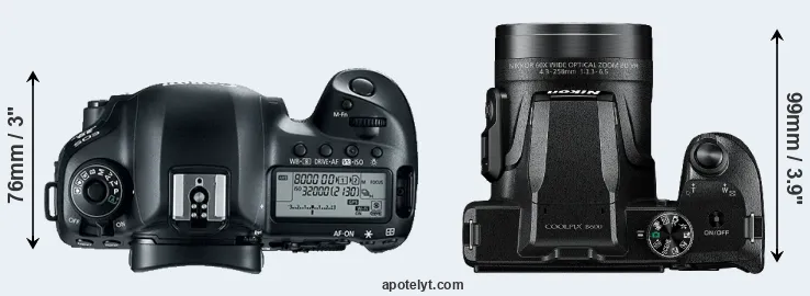 The physical size and weight of the Canon 5D Mark IV and the Nikon B600 are illustrated in the side-by-side display below. The two cameras are presented according to their relative size. Three consecutive views from the front, the top, and the rear side are shown. All size dimensions are rounded to the nearest millimeter.