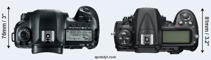 The side-by-side display below illustrates the physical size and weight of the Canon 5D Mark IV and the Nikon D300S. The two cameras are presented according to their relative size. Three consecutive views from the front, the top, and the rear side are shown. All width, height and depth measures are rounded to the nearest millimeter.