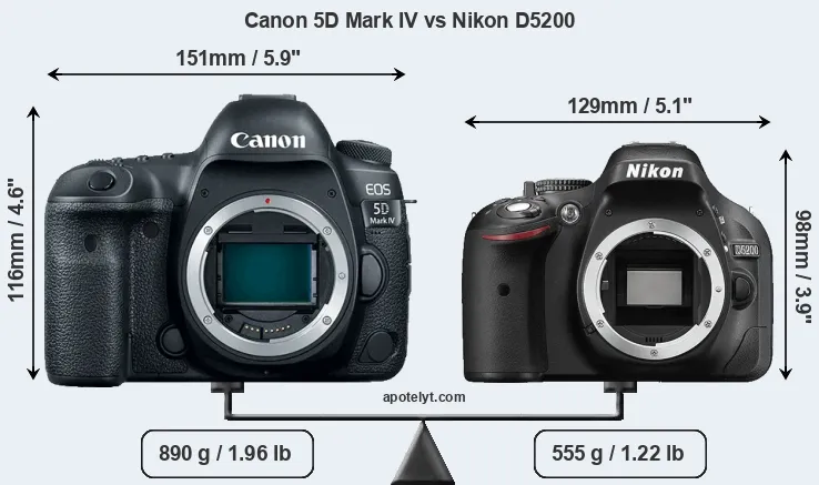 The side-by-side display below illustrates the physical size and weight of the Canon 5D Mark IV and the Nikon D5200. The two cameras are presented according to their relative size. Three consecutive perspectives from the front, the top, and the back are available. All width, height and depth dimensions are rounded to the nearest millimeter.