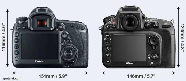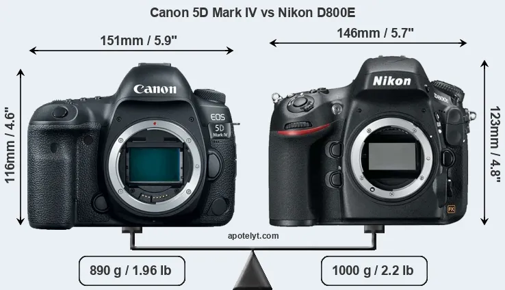 The side-by-side display below illustrates the physical size and weight of the Canon 5D Mark IV and the Nikon D800E. The two cameras are presented according to their relative size. Three consecutive perspectives from the front, the top, and the back are available. All width, height and depth measures are rounded to the nearest millimeter.
