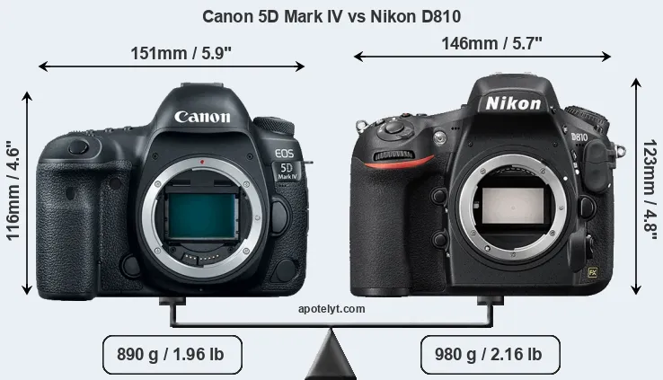 The side-by-side display below illustrates the physical size and weight of the Canon 5D Mark IV and the Nikon D810. The two cameras are presented according to their relative size. Three consecutive perspectives from the front, the top, and the back are available. All width, height and depth measures are rounded to the nearest millimeter.