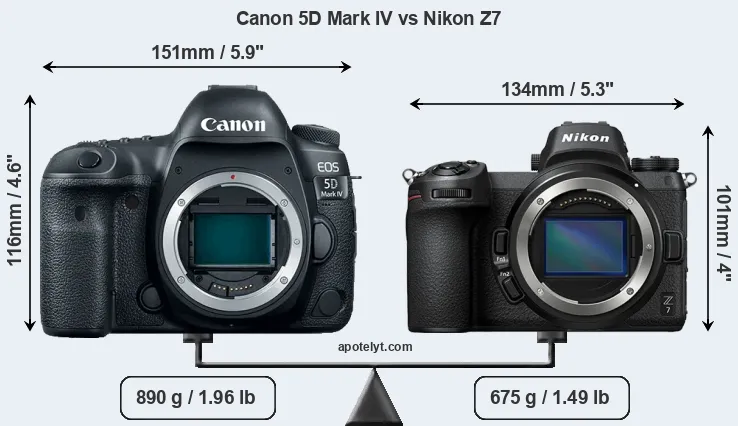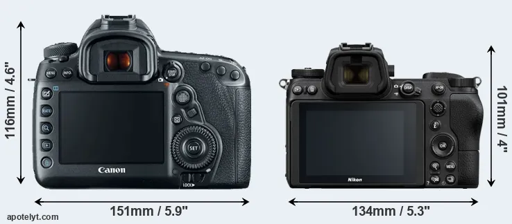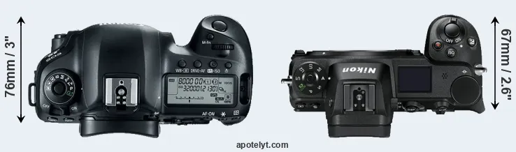 The physical size and weight of the Canon 5D Mark IV and the Nikon Z7 are illustrated in the side-by-side display below. The two cameras are presented according to their relative size. Three consecutive views from the front, the top, and the rear side are shown. All size dimensions are rounded to the nearest millimeter.