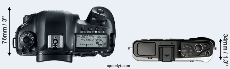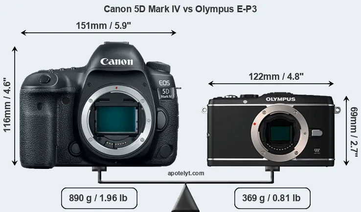 The side-by-side display below illustrates the physical size and weight of the Canon 5D Mark IV and the Olympus E-P3. The two cameras are presented according to their relative size. Three consecutive perspectives from the front, the top, and the back are available. All size dimensions are rounded to the nearest millimeter.