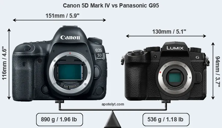 An illustration of the physical size and weight of the Canon 5D Mark IV and the Panasonic G95 is provided in the side-by-side display below. The two cameras are presented according to their relative size. Three successive views from the front, the top, and the rear are shown. All width, height and depth measures are rounded to the nearest millimeter.