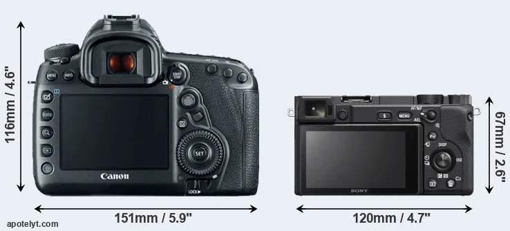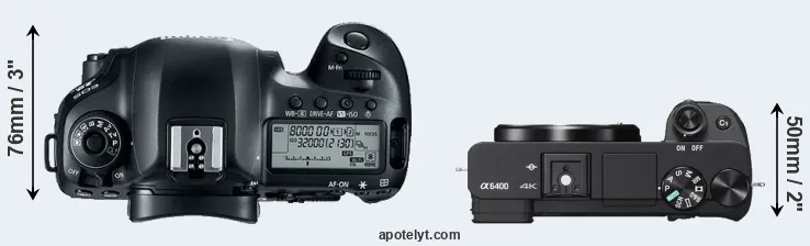 An illustration of the physical size and weight of the Canon 5D Mark IV and the Sony A6400 is provided in the side-by-side display below. The two cameras are presented according to their relative size. Three successive views from the front, the top, and the rear are shown. All size dimensions are rounded to the nearest millimeter.
