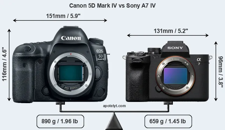 The side-by-side display below illustrates the physical size and weight of the Canon 5D Mark IV and the Sony A7 IV. The two cameras are presented according to their relative size. Three consecutive perspectives from the front, the top, and the back are available. All size dimensions are rounded to the nearest millimeter.