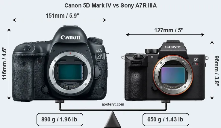The side-by-side display below illustrates the physical size and weight of the Canon 5D Mark IV and the Sony A7R IIIA. The two cameras are presented according to their relative size. Three consecutive perspectives from the front, the top, and the back are available. All width, height and depth measures are rounded to the nearest millimeter.