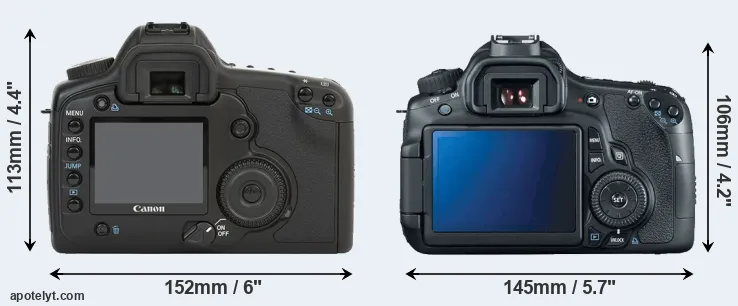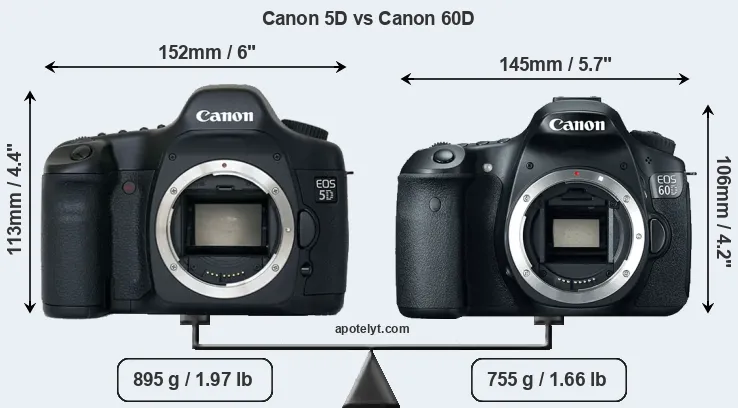 An illustration of the physical size and weight of the Canon 5D and the Canon 60D is provided in the side-by-side display below. The two cameras are presented according to their relative size. Three consecutive perspectives from the front, the top, and the back are available. All size dimensions are rounded to the nearest millimeter.