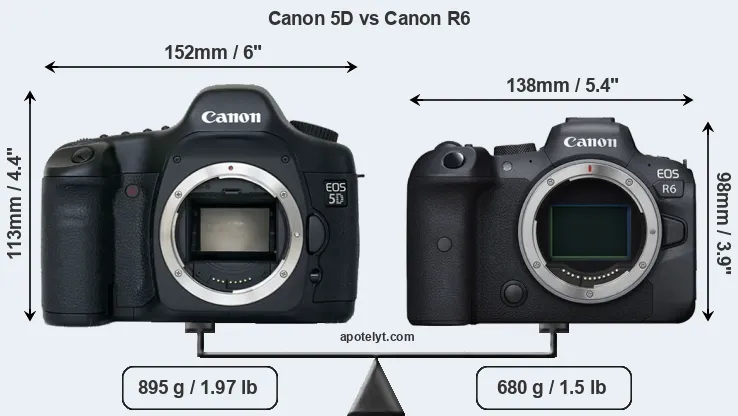 The side-by-side display below illustrates the physical size and weight of the Canon 5D and the Canon R6. The two cameras are presented according to their relative size. Three consecutive perspectives from the front, the top, and the back are available. All size dimensions are rounded to the nearest millimeter.