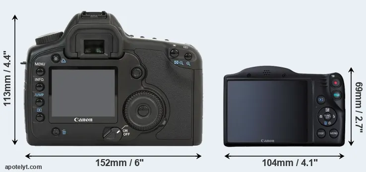 The side-by-side display below illustrates the physical size and weight of the Canon 5D and the Canon SX410. The two cameras are presented according to their relative size. Three consecutive perspectives from the front, the top, and the back are available. All size dimensions are rounded to the nearest millimeter.