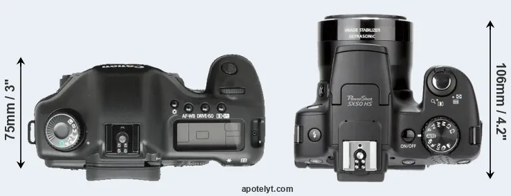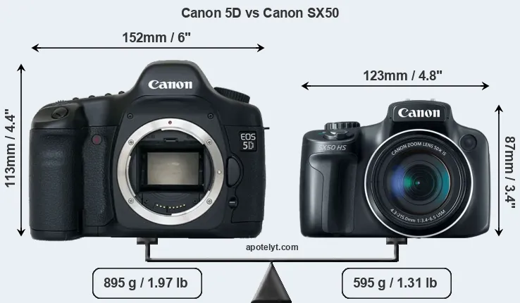 The side-by-side display below illustrates the physical size and weight of the Canon 5D and the Canon SX50. The two cameras are presented according to their relative size. Three consecutive views from the front, the top, and the rear side are shown. All width, height and depth measures are rounded to the nearest millimeter.