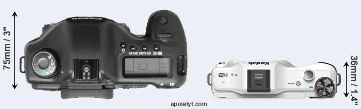 The side-by-side display below illustrates the physical size and weight of the Canon 5D and the Kodak S-1. The two cameras are presented according to their relative size. Three consecutive views from the front, the top, and the rear side are shown. All width, height and depth measures are rounded to the nearest millimeter.
