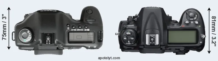 The side-by-side display below illustrates the physical size and weight of the Canon 5D and the Nikon D300S. The two cameras are presented according to their relative size. Three consecutive perspectives from the front, the top, and the back are available. All width, height and depth measures are rounded to the nearest millimeter.