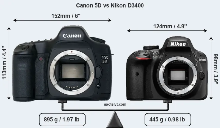 The side-by-side display below illustrates the physical size and weight of the Canon 5D and the Nikon D3400. The two cameras are presented according to their relative size. Three consecutive perspectives from the front, the top, and the back are available. All width, height and depth measures are rounded to the nearest millimeter.