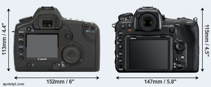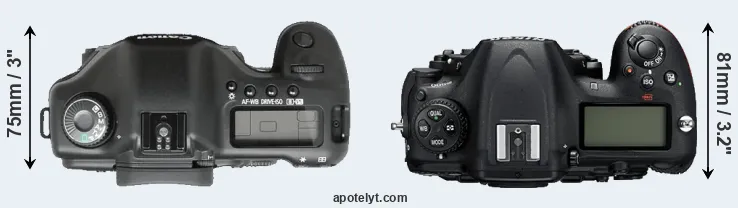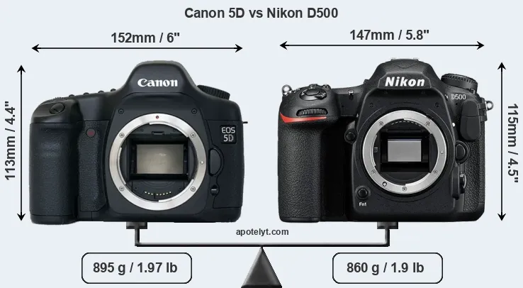 The side-by-side display below illustrates the physical size and weight of the Canon 5D and the Nikon D500. The two cameras are presented according to their relative size. Three consecutive perspectives from the front, the top, and the back are available. All size dimensions are rounded to the nearest millimeter.