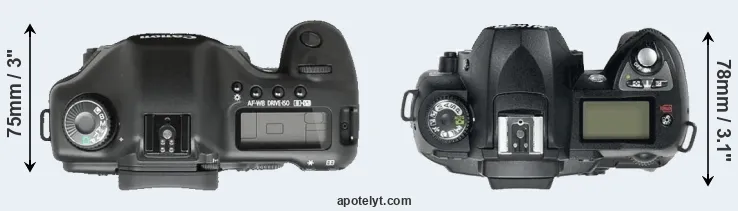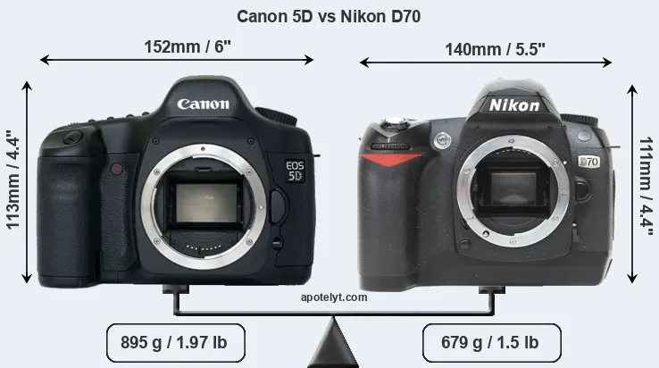The side-by-side display below illustrates the physical size and weight of the Canon 5D and the Nikon D70. The two cameras are presented according to their relative size. Three successive views from the front, the top, and the rear are shown. All width, height and depth dimensions are rounded to the nearest millimeter.