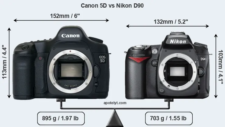 The physical size and weight of the Canon 5D and the Nikon D90 are illustrated in the side-by-side display below. The two cameras are presented according to their relative size. Three successive views from the front, the top, and the rear are shown. All size dimensions are rounded to the nearest millimeter.
