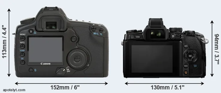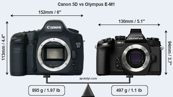 The side-by-side display below illustrates the physical size and weight of the Canon 5D and the Olympus E-M1. The two cameras are presented according to their relative size. Three consecutive perspectives from the front, the top, and the back are available. All width, height and depth measures are rounded to the nearest millimeter.