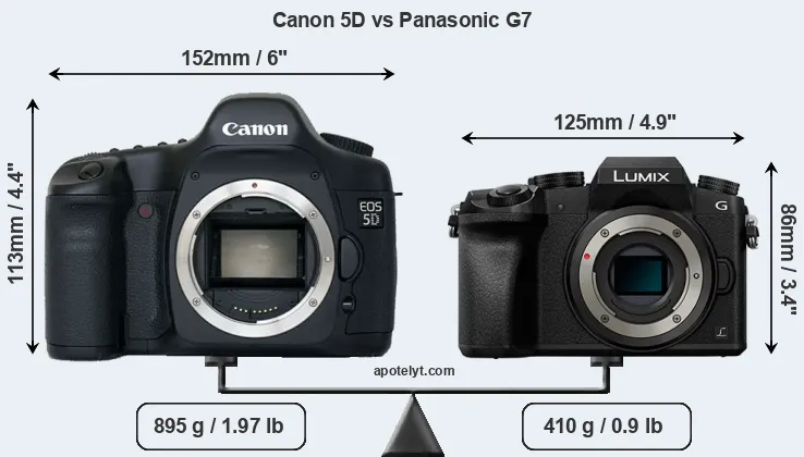 If the front view area (width x height) of the cameras is taken as an aggregate measure of their size, the Panasonic G7 is considerably smaller (37 percent) than the Canon 5D. Moreover, the G7 is substantially lighter (54 percent) than the 5D. It is worth mentioning in this context that the 5D is splash and dust resistant, while the G7 does not feature any corresponding weather-sealing.