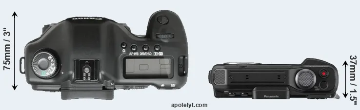 The side-by-side display below illustrates the physical size and weight of the Canon 5D and the Panasonic TS7. The two cameras are presented according to their relative size. Three successive views from the front, the top, and the rear are shown. All size dimensions are rounded to the nearest millimeter.