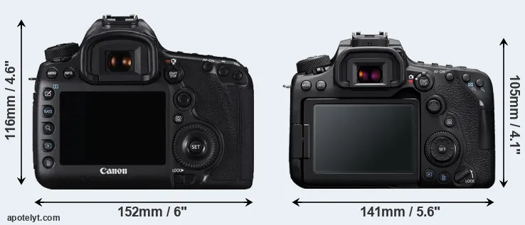 The physical size and weight of the Canon 5DS R and the Canon 90D are illustrated in the side-by-side display below. The two cameras are presented according to their relative size. Three consecutive views from the front, the top, and the rear side are shown. All width, height and depth dimensions are rounded to the nearest millimeter.