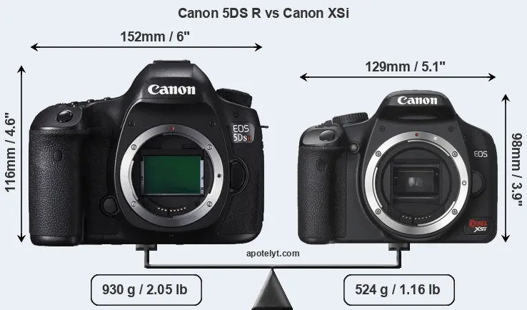 The side-by-side display below illustrates the physical size and weight of the Canon 5DS R and the Canon XSi. The two cameras are presented according to their relative size. Three successive views from the front, the top, and the rear are shown. All width, height and depth measures are rounded to the nearest millimeter.