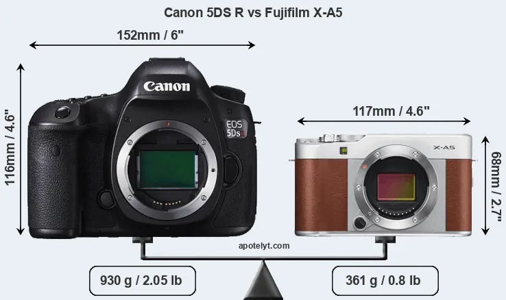 The side-by-side display below illustrates the physical size and weight of the Canon 5DS R and the Fujifilm X-A5. The two cameras are presented according to their relative size. Three consecutive perspectives from the front, the top, and the back are available. All width, height and depth dimensions are rounded to the nearest millimeter.