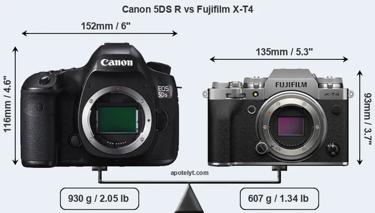 The side-by-side display below illustrates the physical size and weight of the Canon 5DS R and the Fujifilm X-T4. The two cameras are presented according to their relative size. Three successive views from the front, the top, and the rear are shown. All width, height and depth measures are rounded to the nearest millimeter.