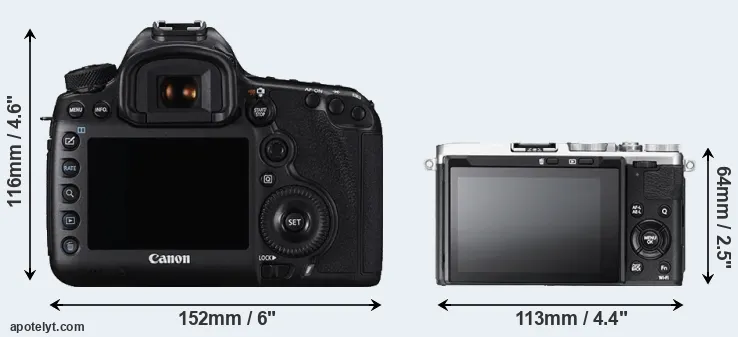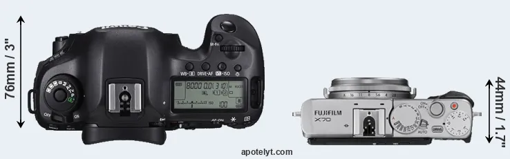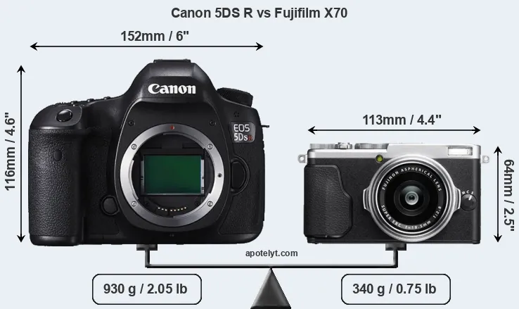 The physical size and weight of the Canon 5DS R and the Fujifilm X70 are illustrated in the side-by-side display below. The two cameras are presented according to their relative size. Three successive views from the front, the top, and the rear are shown. All width, height and depth dimensions are rounded to the nearest millimeter.