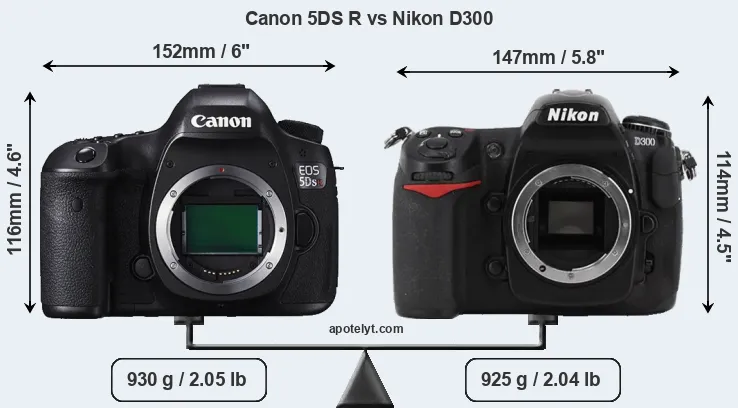 The physical size and weight of the Canon 5DS R and the Nikon D300 are illustrated in the side-by-side display below. The two cameras are presented according to their relative size. Three consecutive perspectives from the front, the top, and the back are available. All size dimensions are rounded to the nearest millimeter.