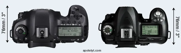 The physical size and weight of the Canon 5DS R and the Nikon D50 are illustrated in the side-by-side display below. The two cameras are presented according to their relative size. Three successive views from the front, the top, and the rear are shown. All width, height and depth measures are rounded to the nearest millimeter.