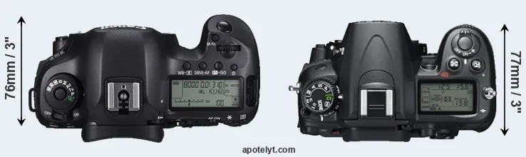The physical size and weight of the Canon 5DS R and the Nikon D7000 are illustrated in the side-by-side display below. The two cameras are presented according to their relative size. Three consecutive views from the front, the top, and the rear side are shown. All width, height and depth measures are rounded to the nearest millimeter.