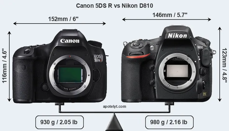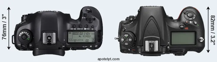 The physical size and weight of the Canon 5DS R and the Nikon D810 are illustrated in the side-by-side display below. The two cameras are presented according to their relative size. Three successive views from the front, the top, and the rear are shown. All width, height and depth measures are rounded to the nearest millimeter.
