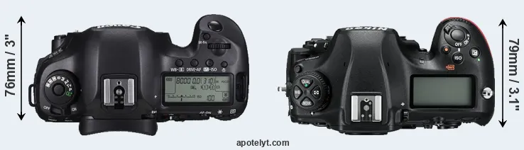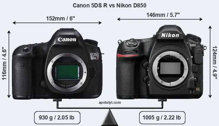 An illustration of the physical size and weight of the Canon 5DS R and the Nikon D850 is provided in the side-by-side display below. The two cameras are presented according to their relative size. Three successive views from the front, the top, and the rear are shown. All size dimensions are rounded to the nearest millimeter.