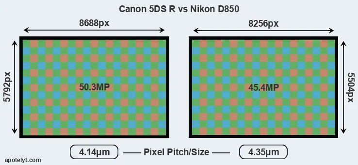 With 50.3MP, the 5DS R offers a higher resolution than the D850 (45.4MP), but the 5DS R has smaller individual pixels (pixel pitch of 4.14μm versus 4.35μm for the D850). Moreover, the D850 is a much more recent model (by 2 years and 5 months) than the 5DS R, and its sensor will have benefitted from technological advances during this time that enhance the light gathering capacity of its pixels. Coming back to sensor resolution, it should be mentioned that neither of the two cameras has an anti-alias filter installed, so they are able to capture all the detail the sensor resolves.