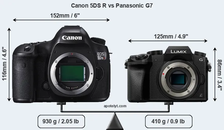 An illustration of the physical size and weight of the Canon 5DS R and the Panasonic G7 is provided in the side-by-side display below. The two cameras are presented according to their relative size. Three consecutive perspectives from the front, the top, and the back are available. All width, height and depth dimensions are rounded to the nearest millimeter.
