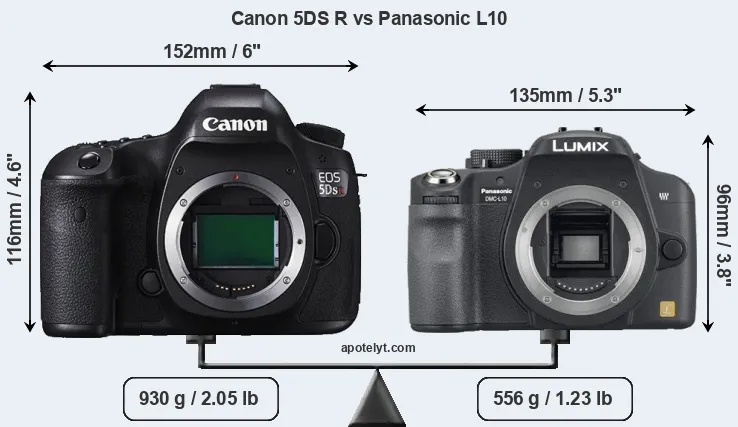 The physical size and weight of the Canon 5DS R and the Panasonic L10 are illustrated in the side-by-side display below. The two cameras are presented according to their relative size. Three consecutive views from the front, the top, and the rear side are shown. All width, height and depth measures are rounded to the nearest millimeter.
