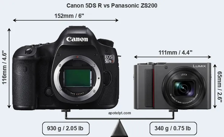 The side-by-side display below illustrates the physical size and weight of the Canon 5DS R and the Panasonic ZS200. The two cameras are presented according to their relative size. Three consecutive perspectives from the front, the top, and the back are available. All size dimensions are rounded to the nearest millimeter.