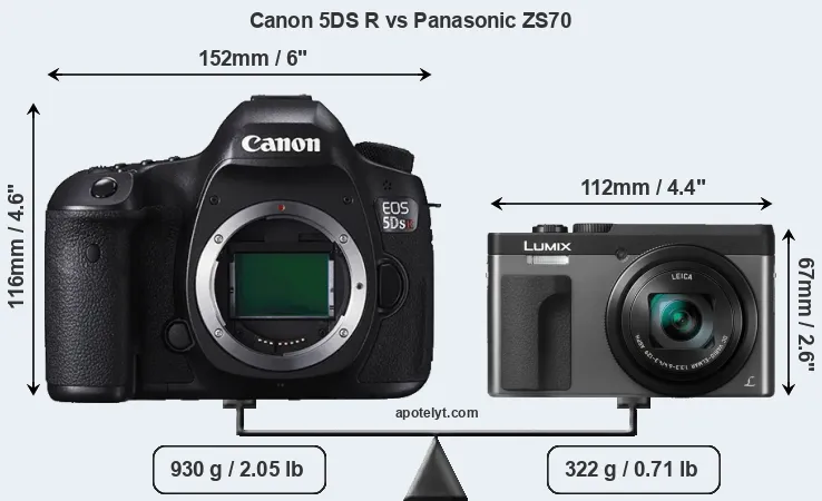 The side-by-side display below illustrates the physical size and weight of the Canon 5DS R and the Panasonic ZS70. The two cameras are presented according to their relative size. Three consecutive perspectives from the front, the top, and the back are available. All width, height and depth measures are rounded to the nearest millimeter.