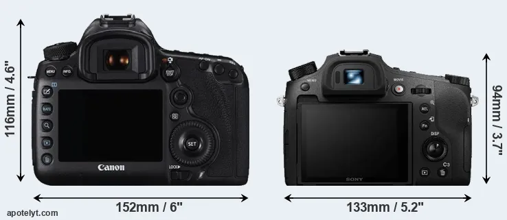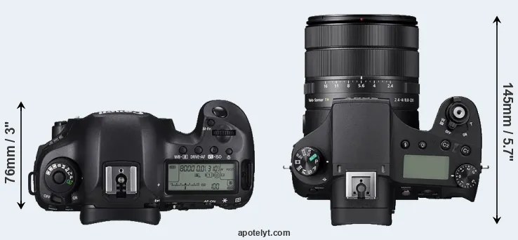 The physical size and weight of the Canon 5DS R and the Sony RX10 IV are illustrated in the side-by-side display below. The two cameras are presented according to their relative size. Three consecutive views from the front, the top, and the rear side are shown. All size dimensions are rounded to the nearest millimeter.