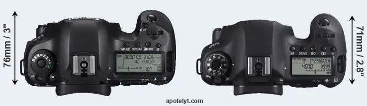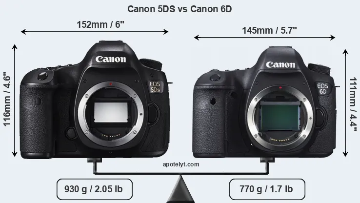 The physical size and weight of the Canon 5DS and the Canon 6D are illustrated in the side-by-side display below. The two cameras are presented according to their relative size. Three successive views from the front, the top, and the rear are shown. All width, height and depth measures are rounded to the nearest millimeter.