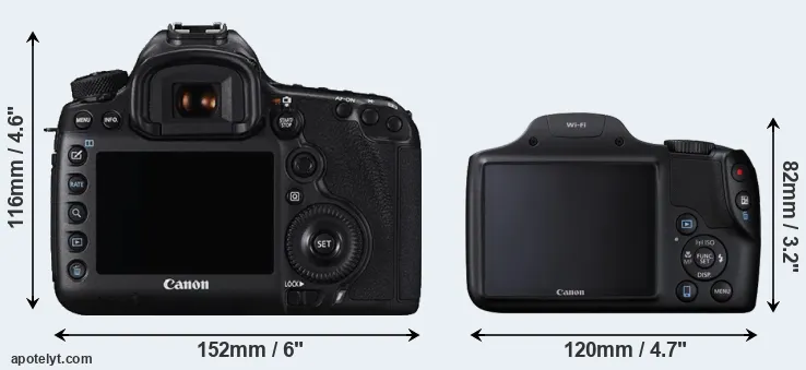 If the front view area (width x height) of the cameras is taken as an aggregate measure of their size, the Canon SX530 is considerably smaller (44 percent) than the Canon 5DS. It is worth mentioning in this context that the 5DS is splash and dust resistant, while the SX530 does not feature any corresponding weather-sealing.