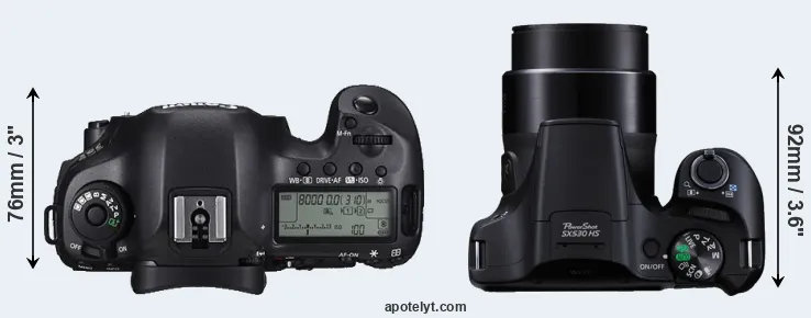 The physical size and weight of the Canon 5DS and the Canon SX530 are illustrated in the side-by-side display below. The two cameras are presented according to their relative size. Three consecutive views from the front, the top, and the rear side are shown. All size dimensions are rounded to the nearest millimeter.