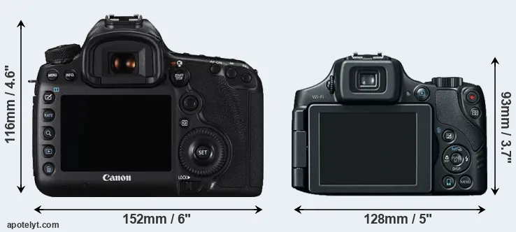The side-by-side display below illustrates the physical size and weight of the Canon 5DS and the Canon SX60. The two cameras are presented according to their relative size. Three consecutive views from the front, the top, and the rear side are shown. All width, height and depth dimensions are rounded to the nearest millimeter.