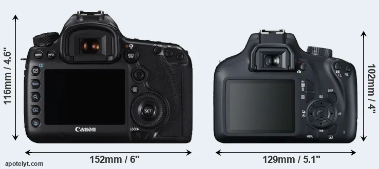 The side-by-side display below illustrates the physical size and weight of the Canon 5DS and the Canon T100. The two cameras are presented according to their relative size. Three consecutive perspectives from the front, the top, and the back are available. All width, height and depth dimensions are rounded to the nearest millimeter.